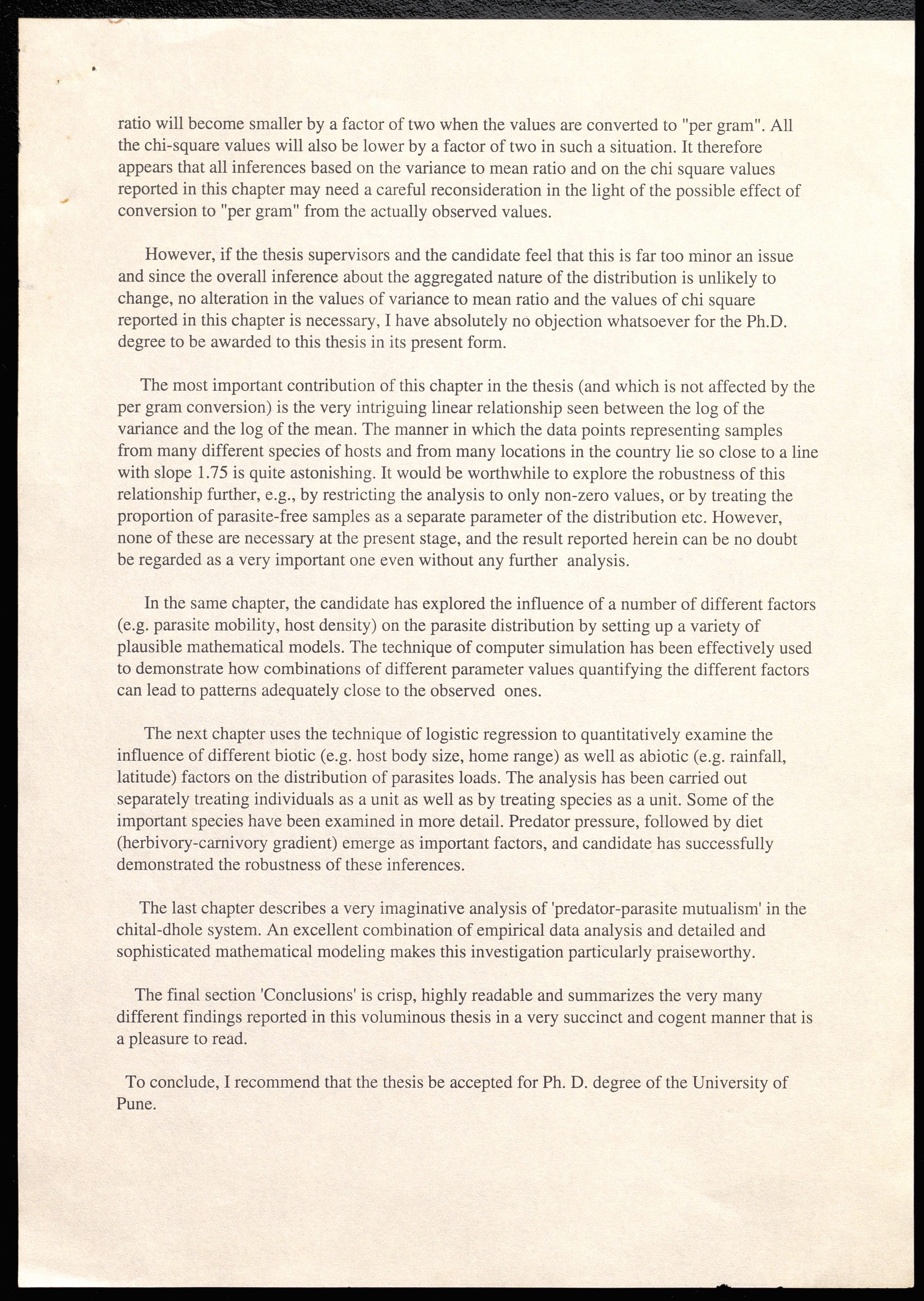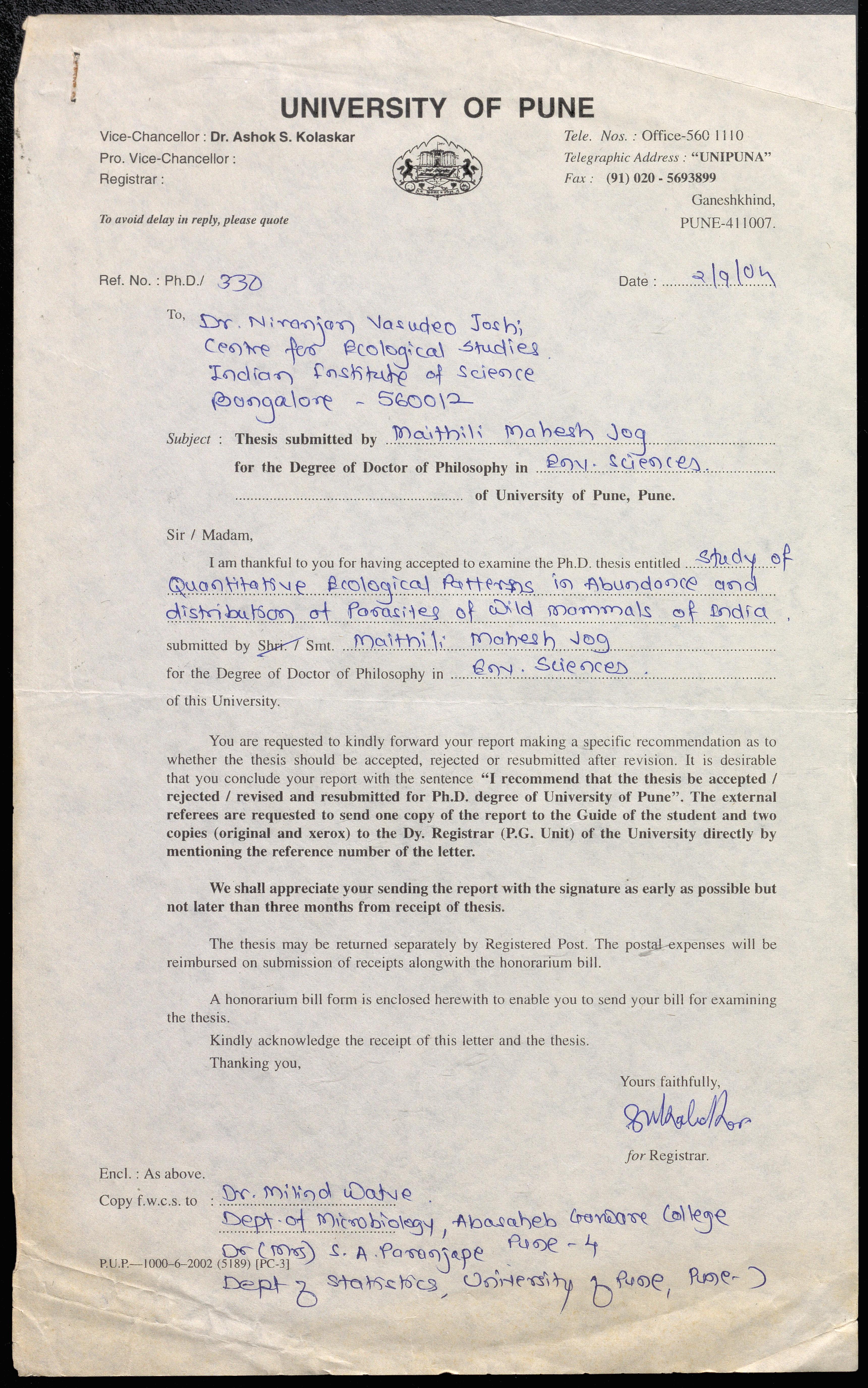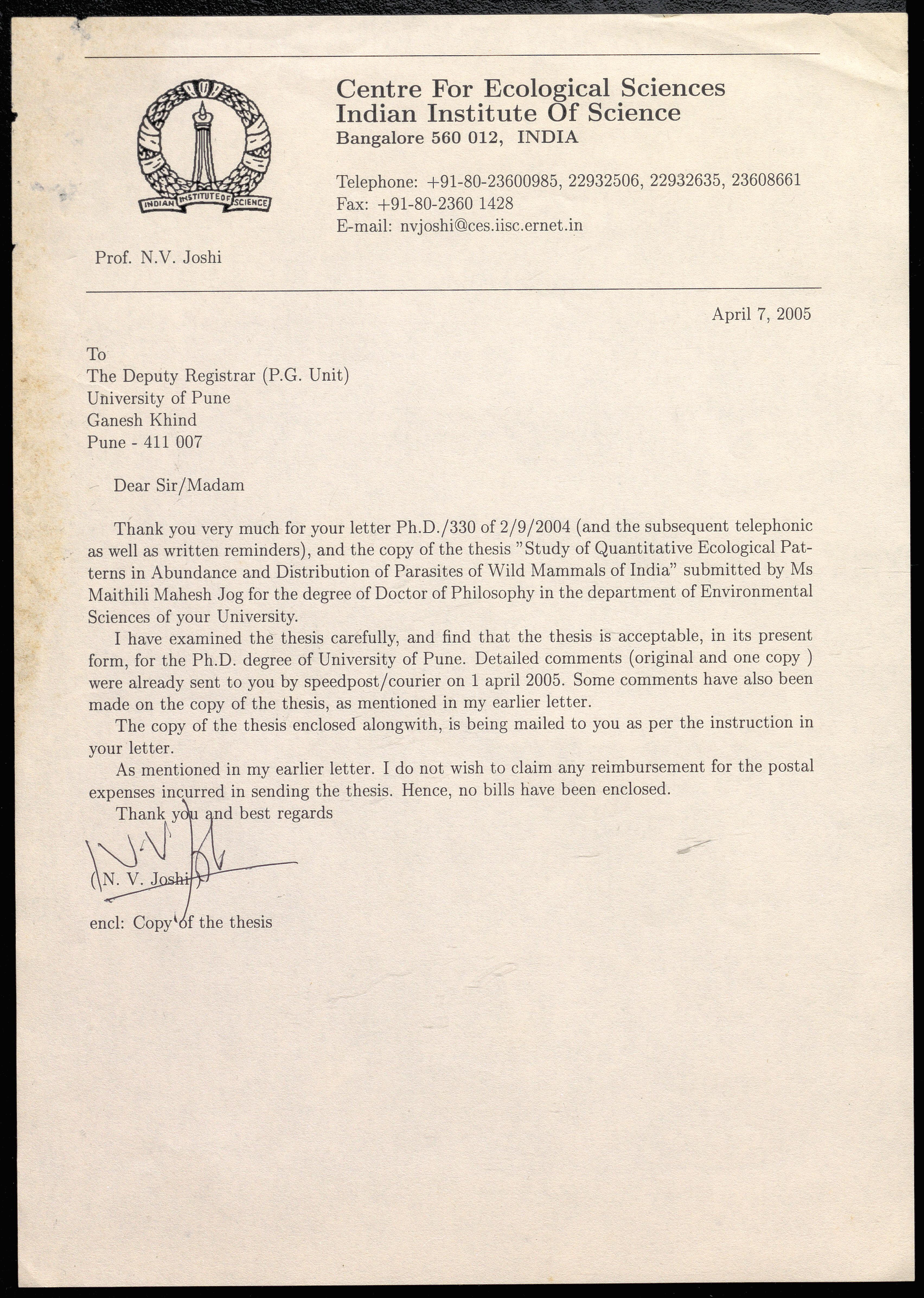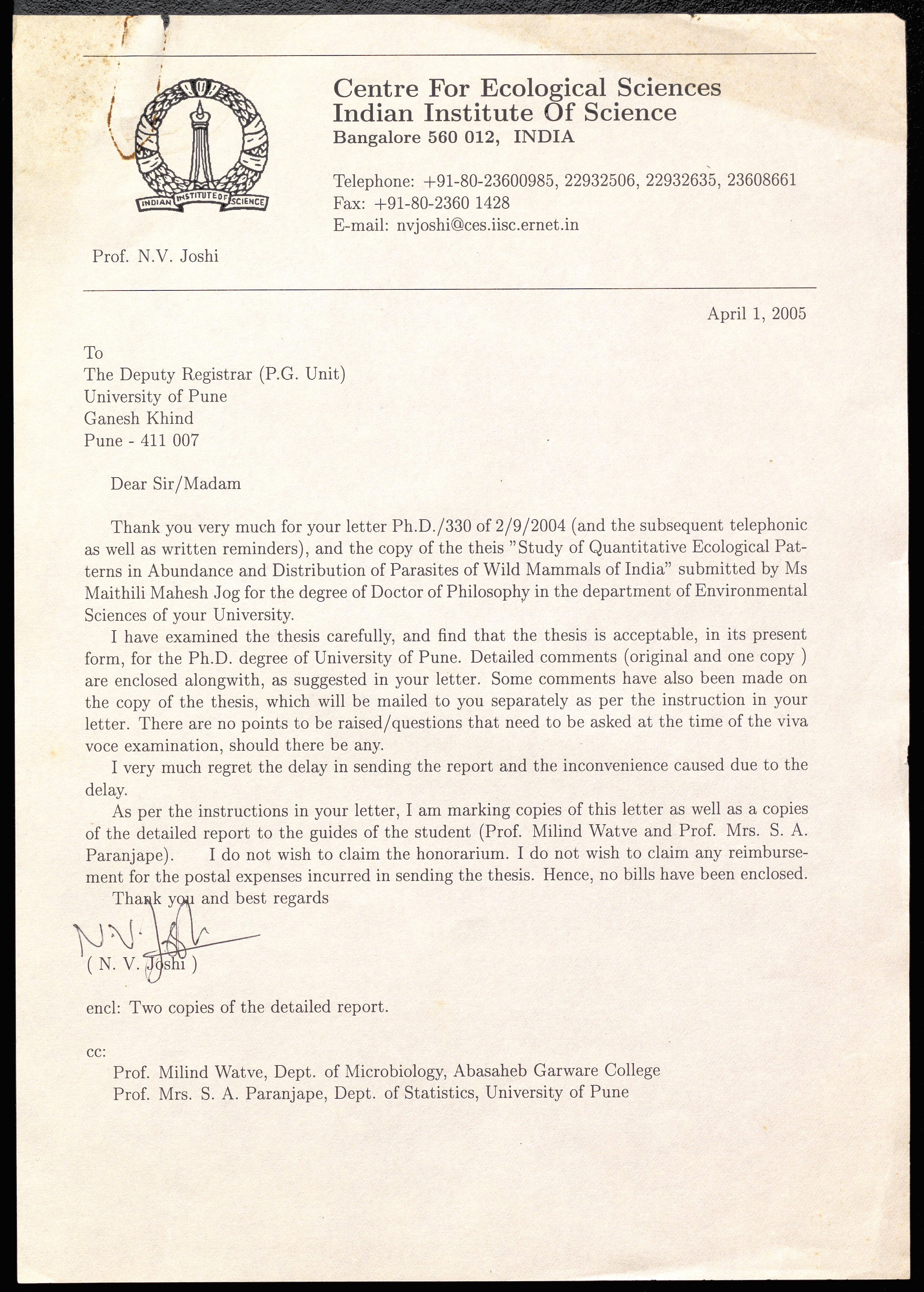 i. Letter to N V Joshi regarding a thesis submitted by Maithili Mahesh Jog for the Ph. D. degree in Environmental Sciences titled "Study of Quantitative Ecological Patterns in Abundance and Distribution of Parasites Wild Mammals of India, the report of N V Joshi for the thesis is also attached. ii. Two letters to the Deputy Registrar of the University of Pune regarding the same thesis, iii. Letters to N V Joshi regarding his nomination as the Subject Expert for the selection of professors, readers and lecturers in Center for Modelling and Simulation.