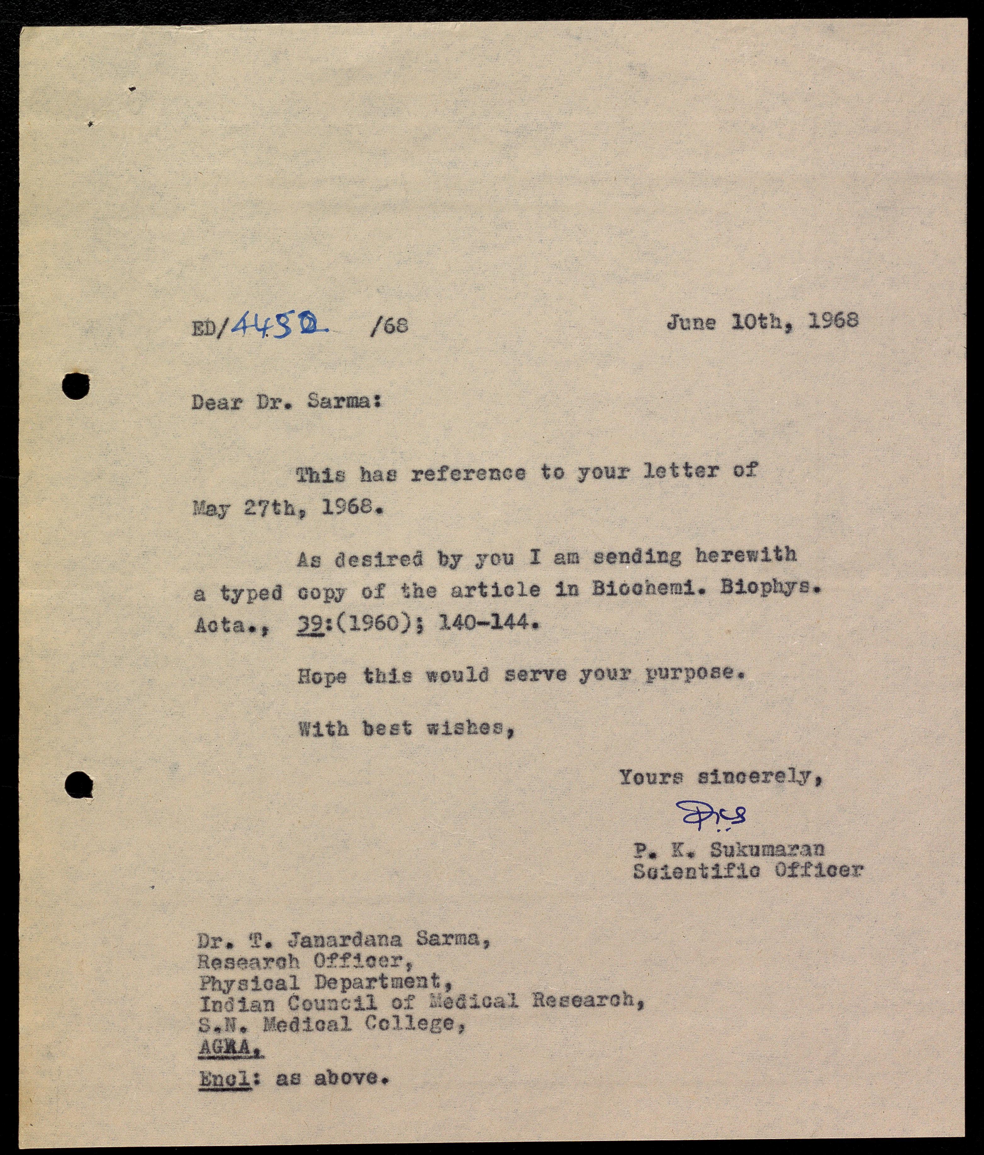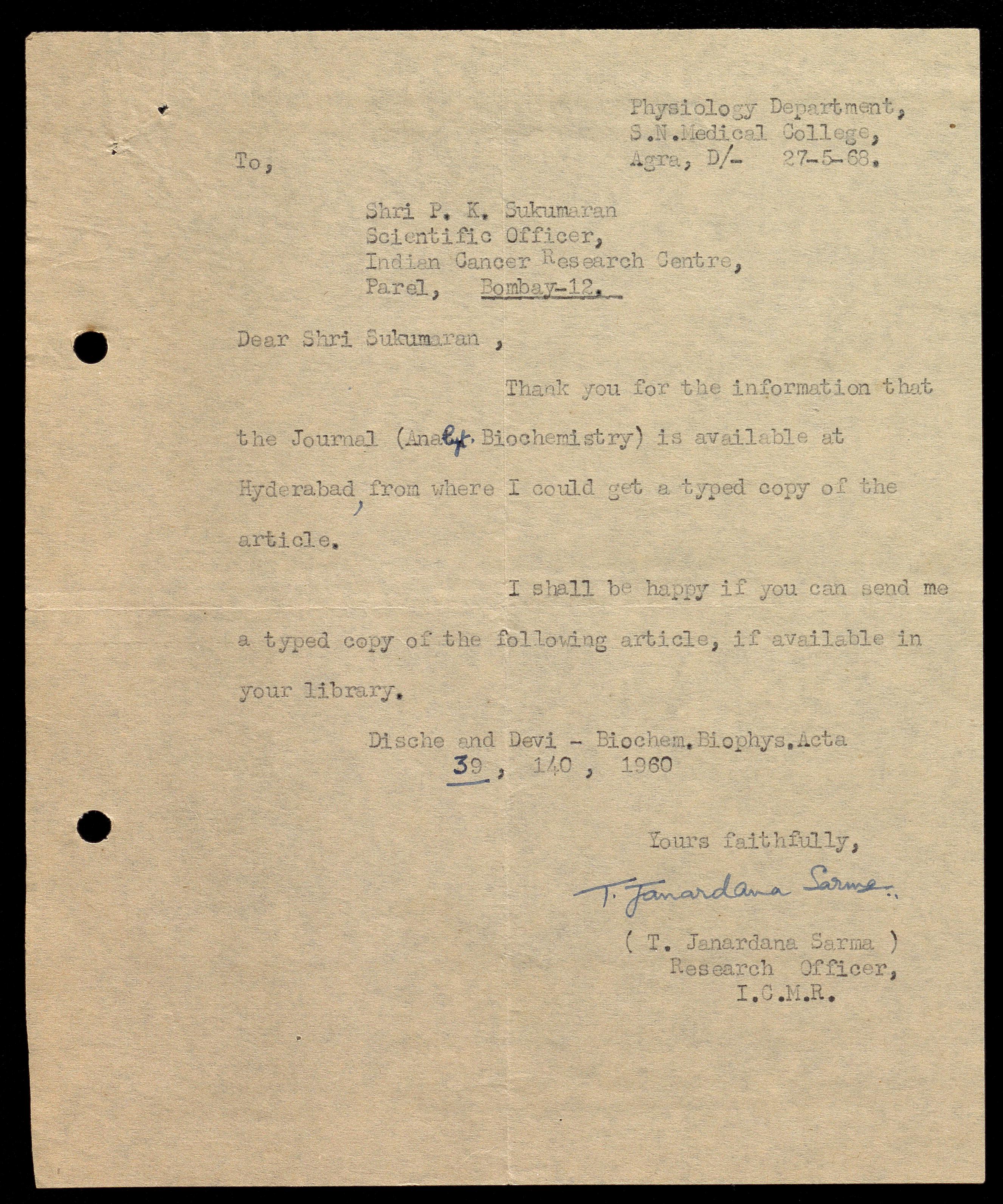 Letter from Janardana Sarma, research officer at ICMR, requesting a copy of Sukumaran's paper. Enclosed is also his response