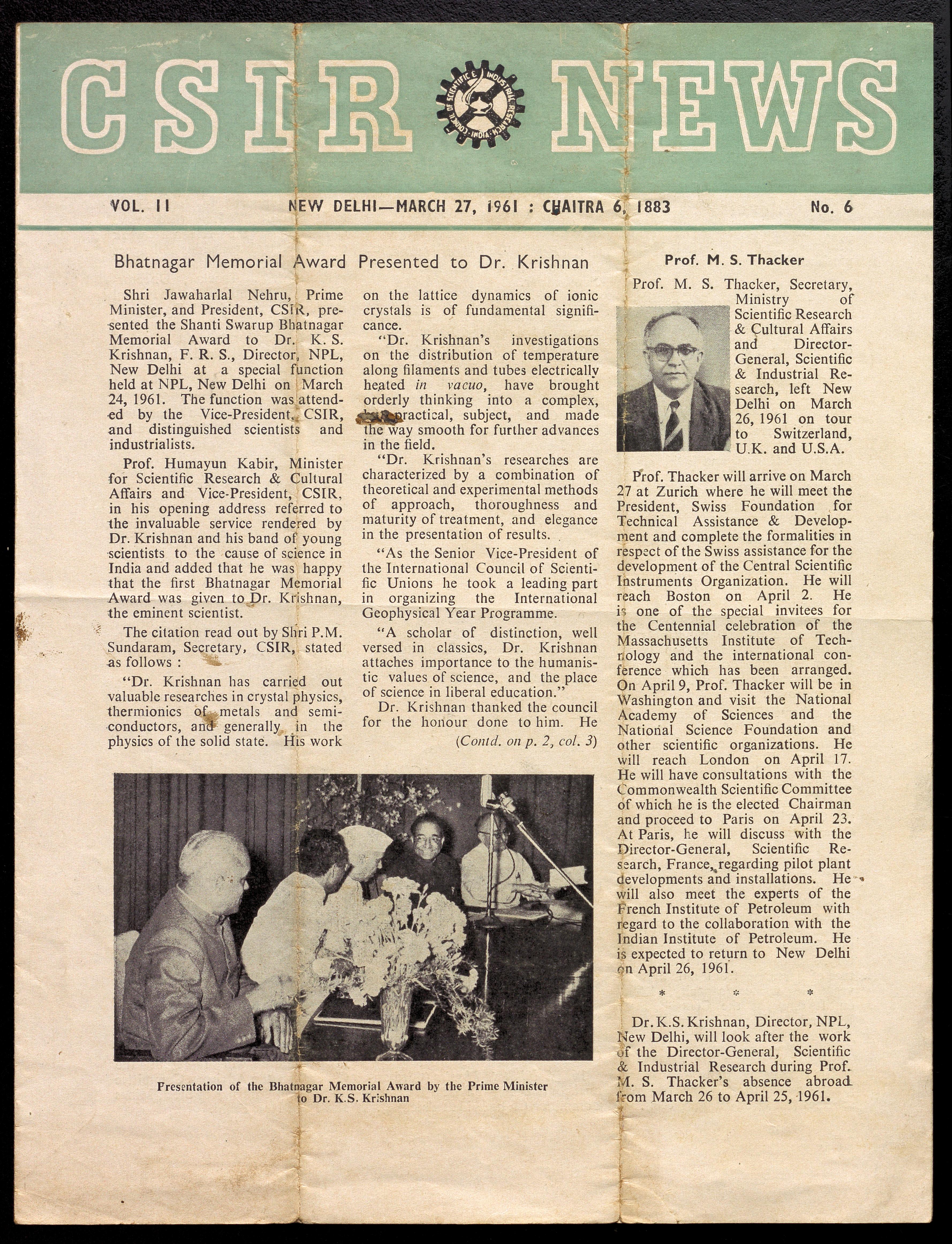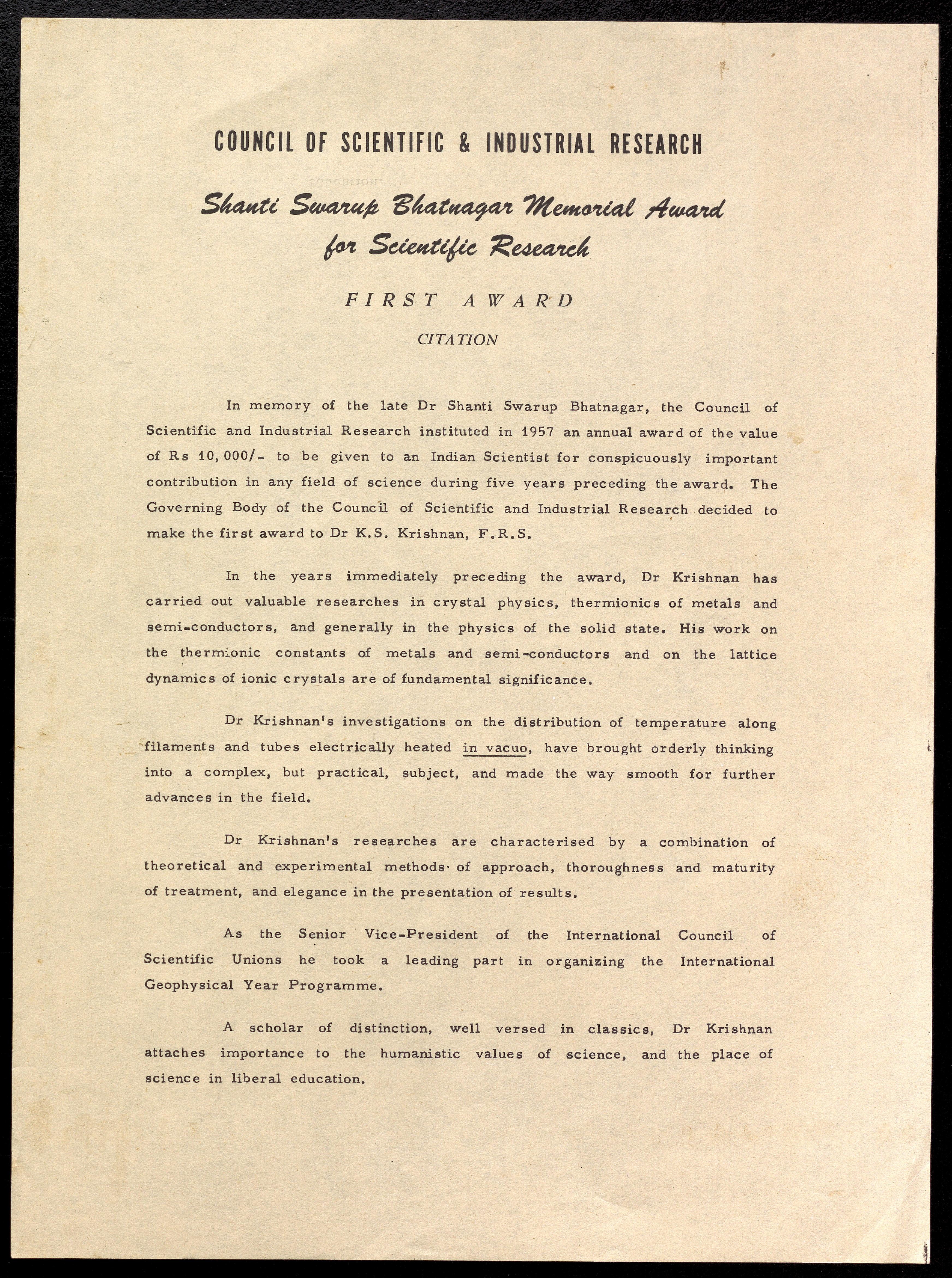 i) American Association for the Advancement of Science- elected as a Fellow, ii) Shanti Swarup Bhatnagar Memorial Award for Scientific Research- First Award- Citation, iii) Media clipping- "Bhatnagar Memorial Award presented to Dr Krishnan".