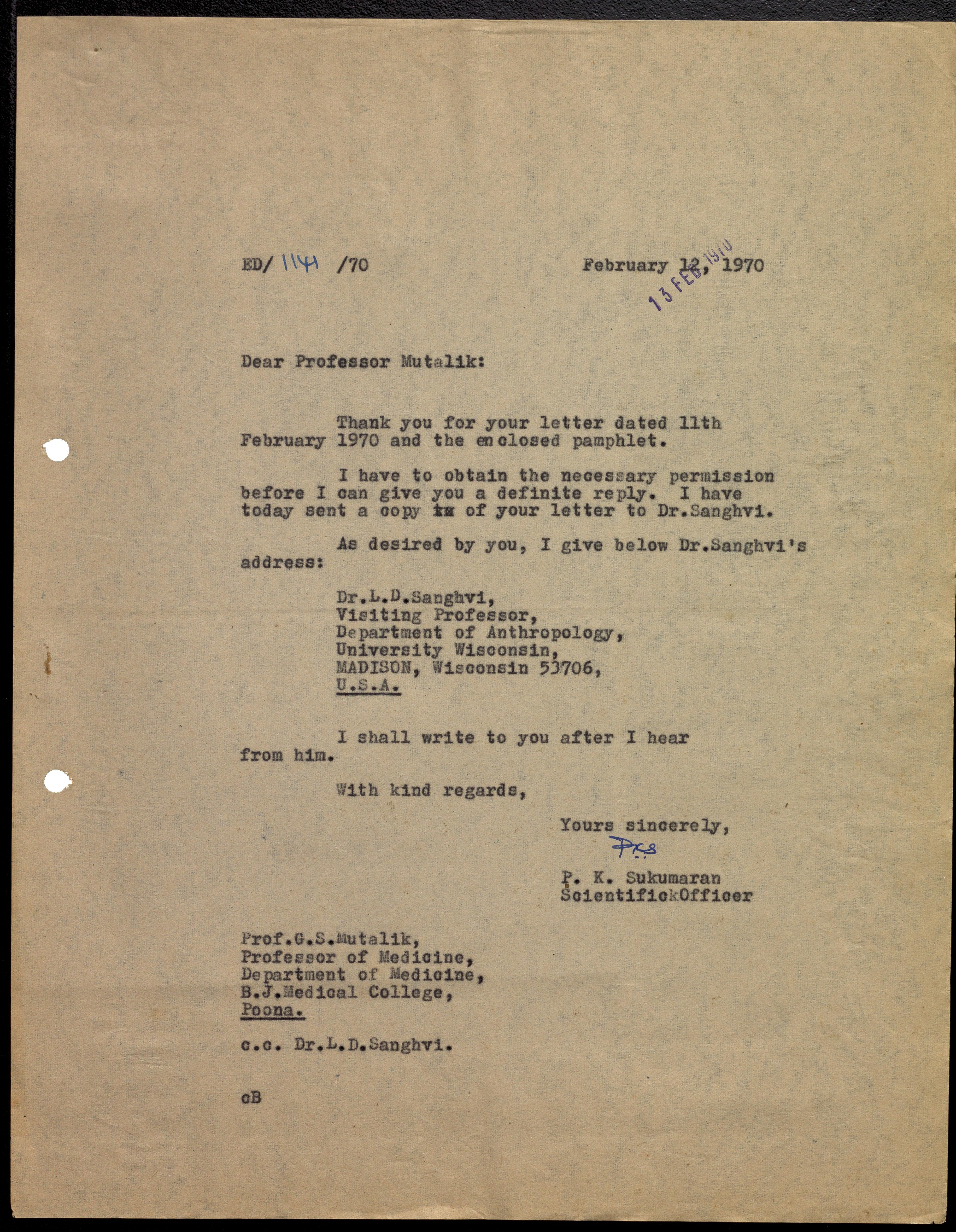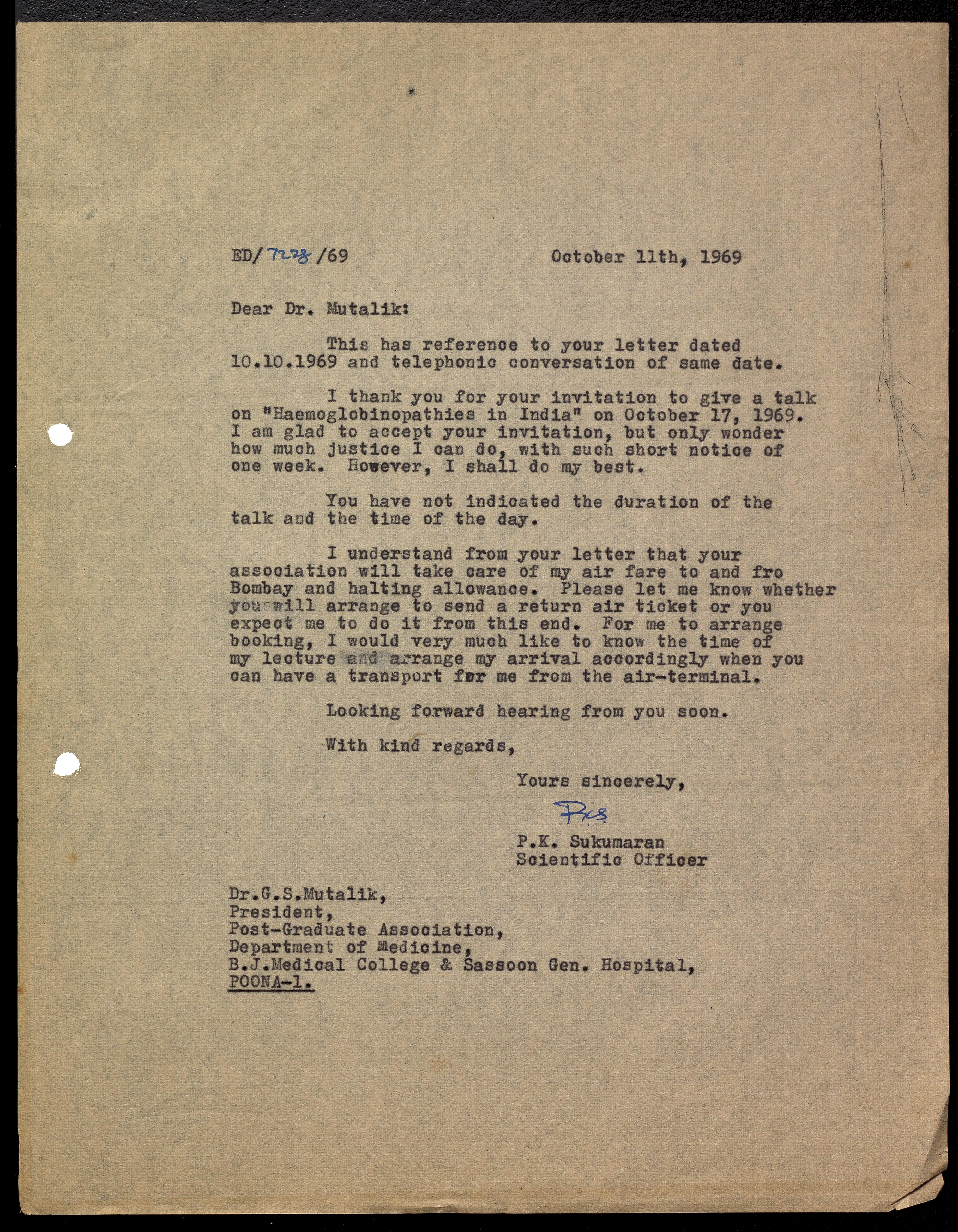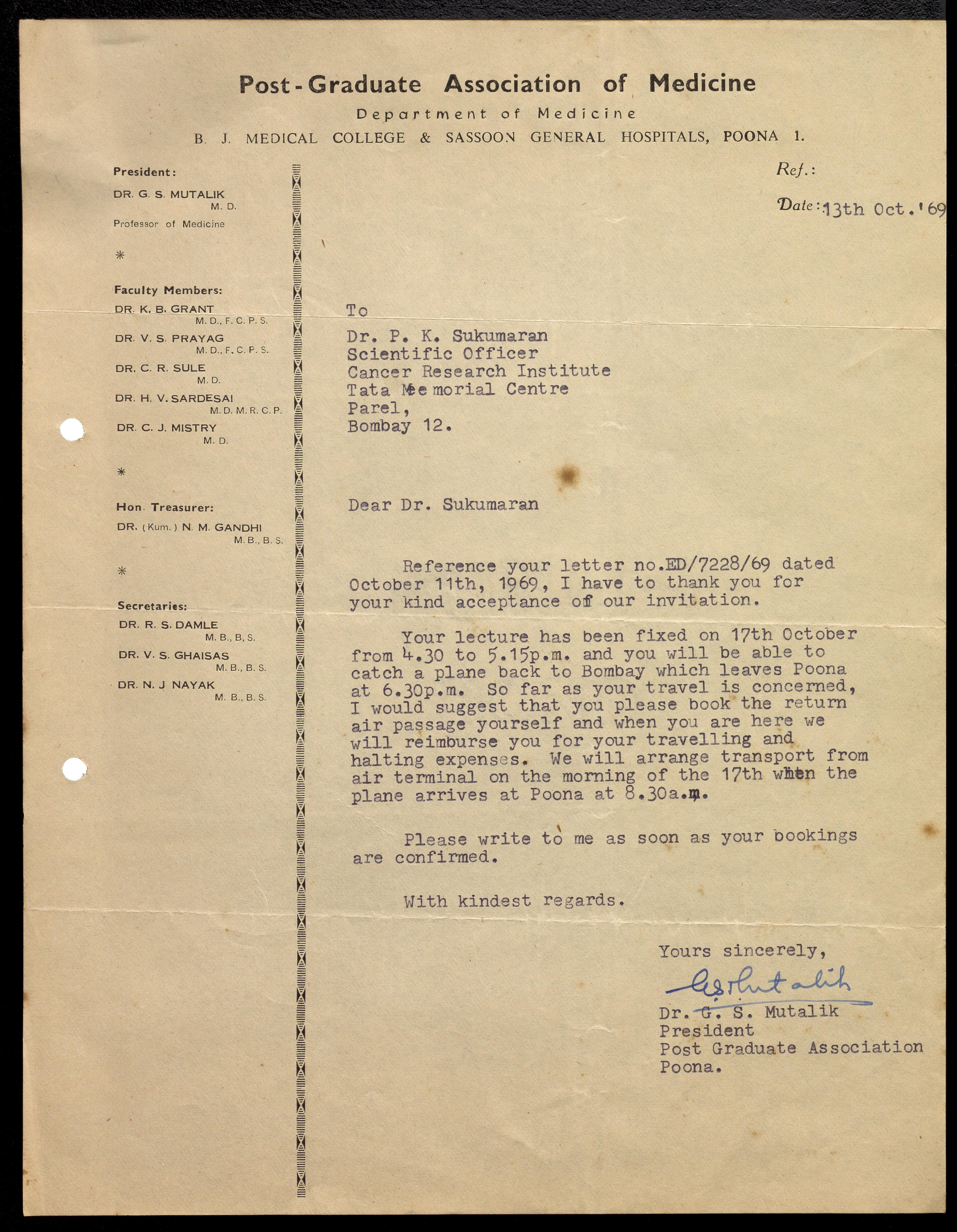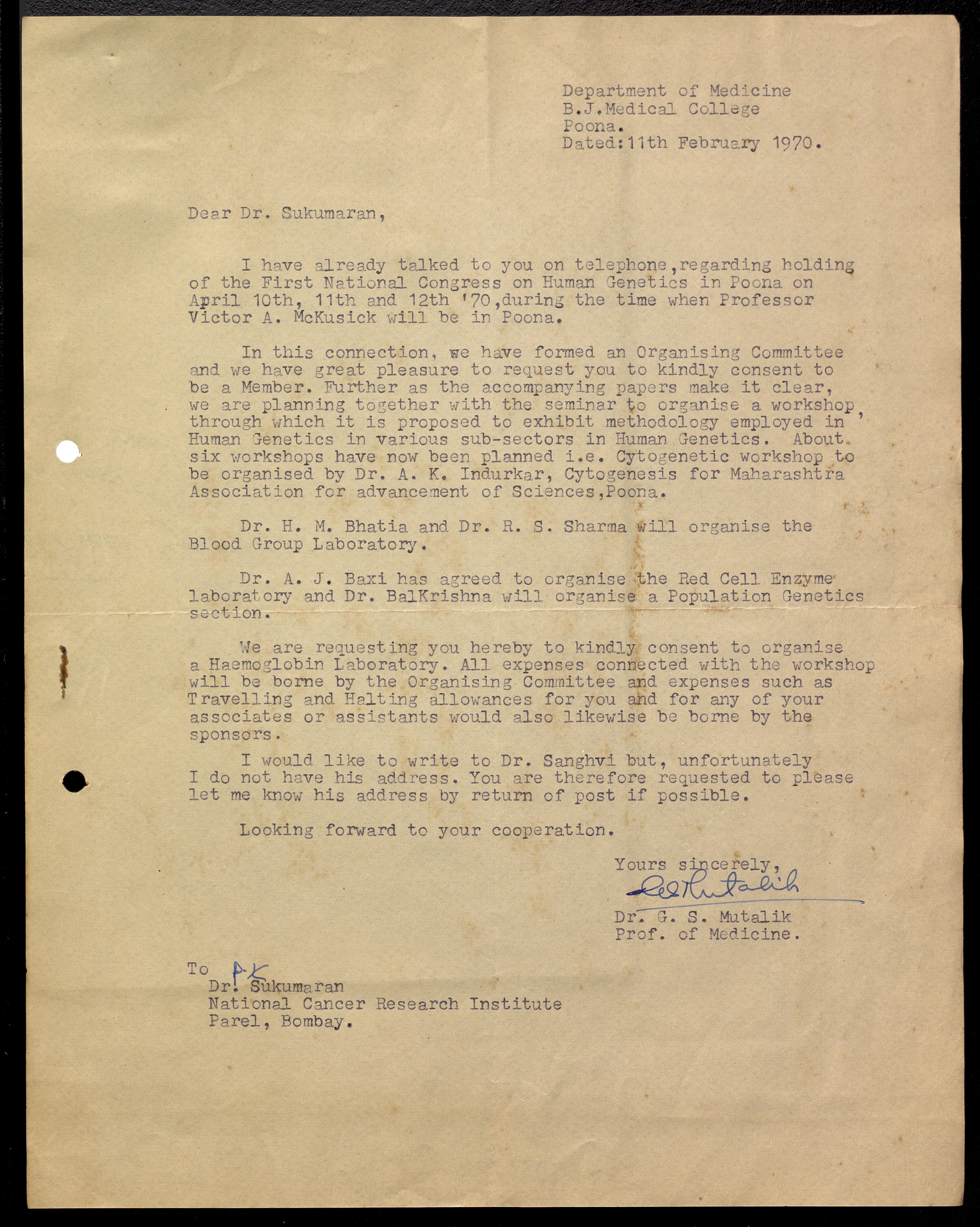 Mutalik, G. S. -- Correspondence