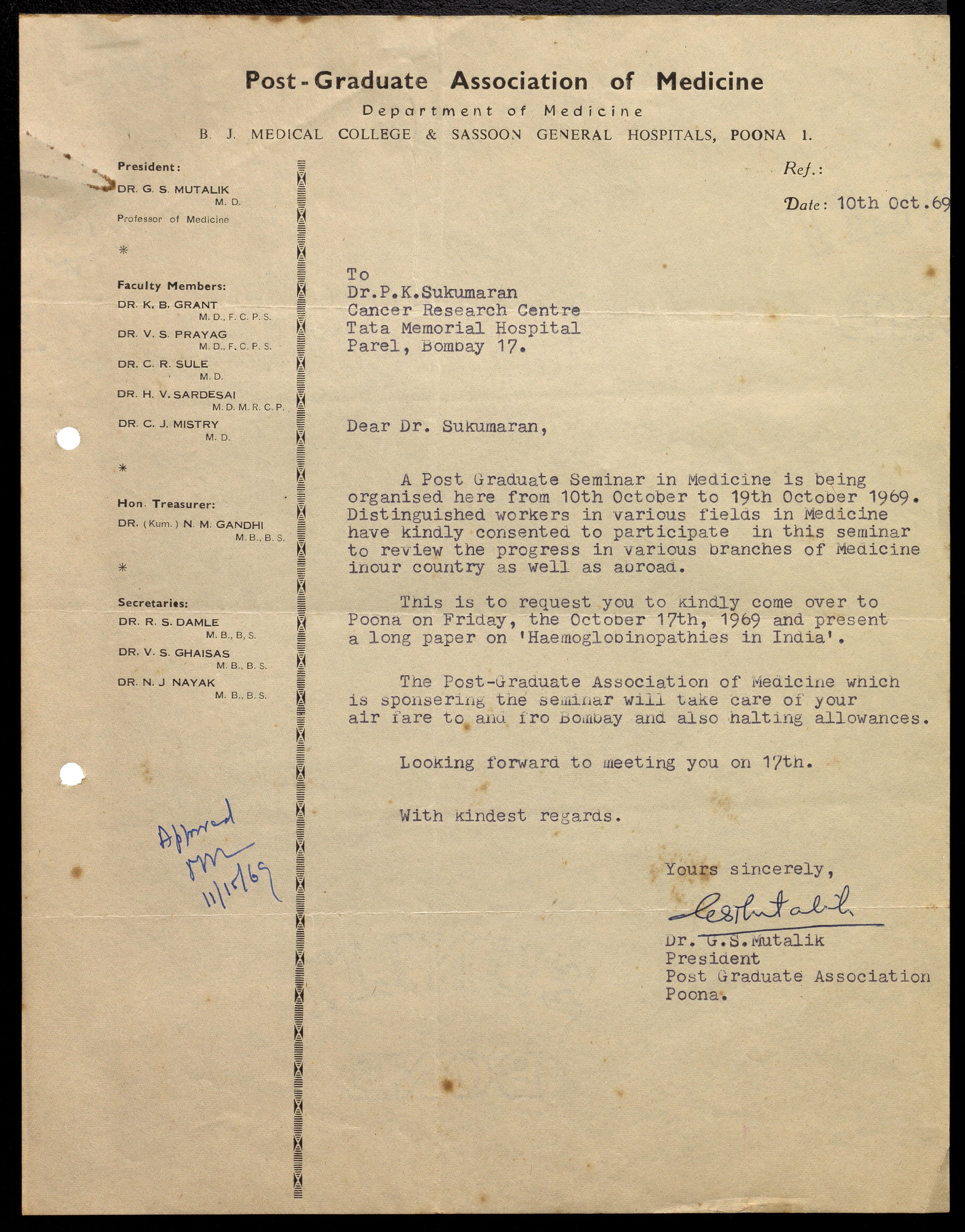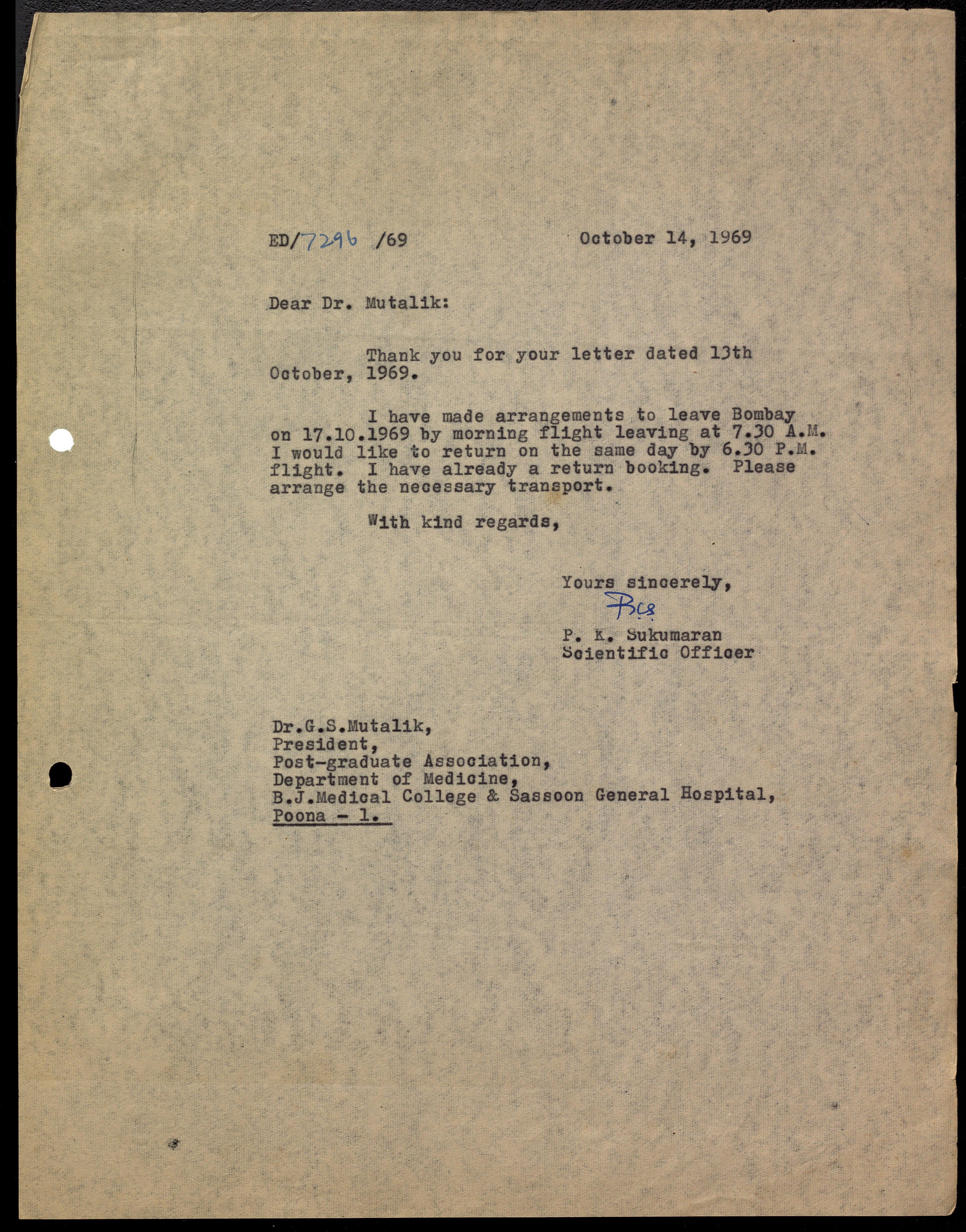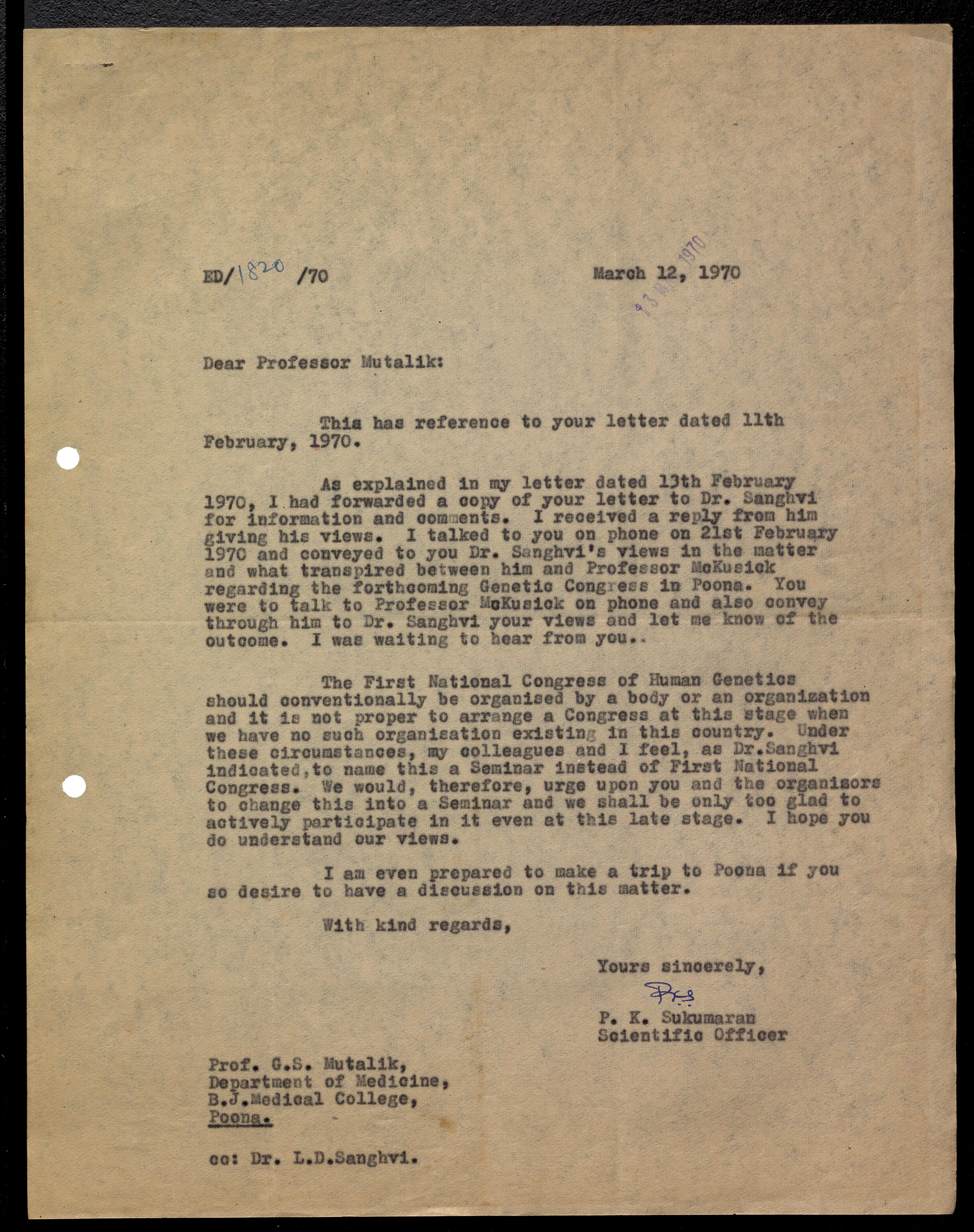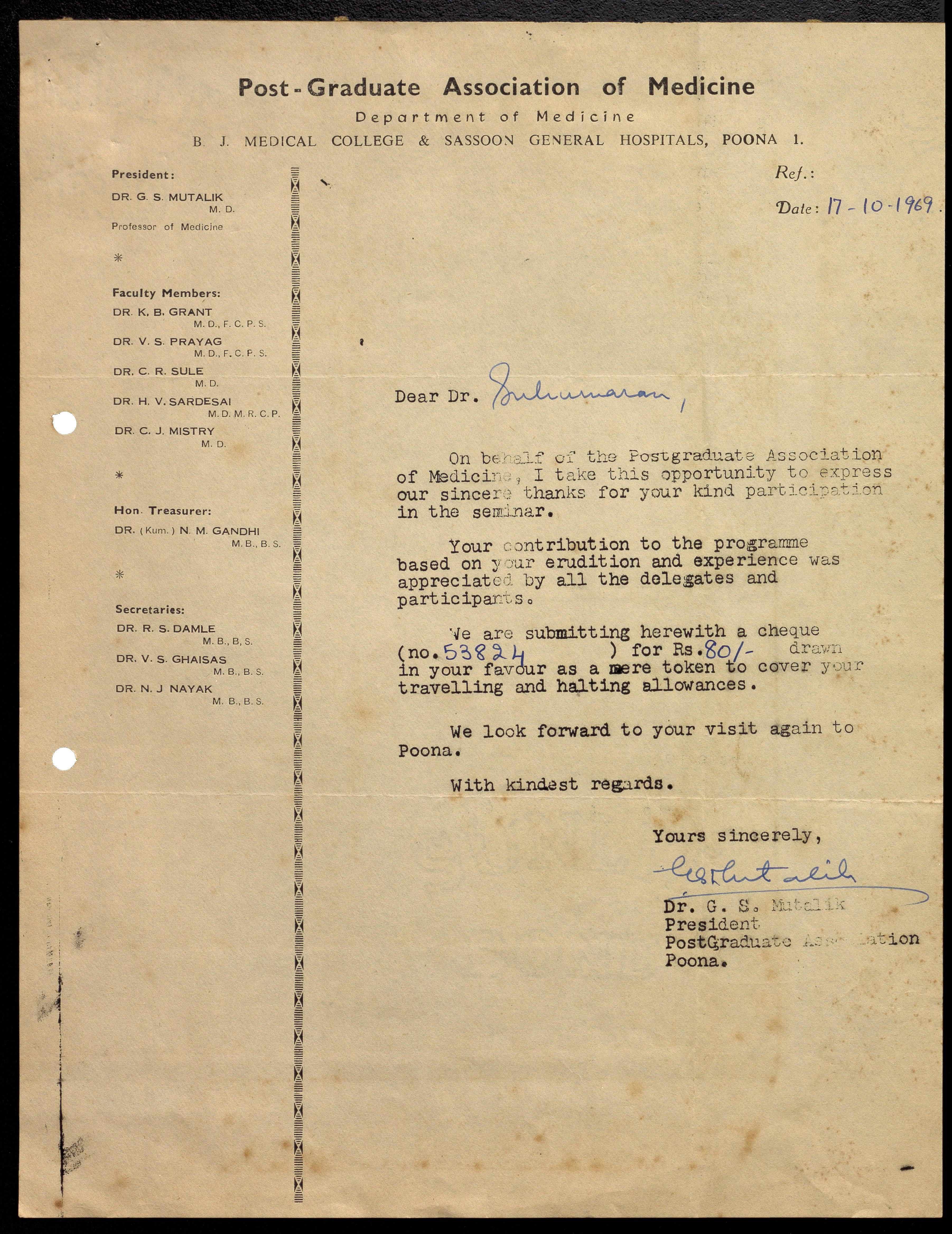 Mutalik, G. S. -- Correspondence