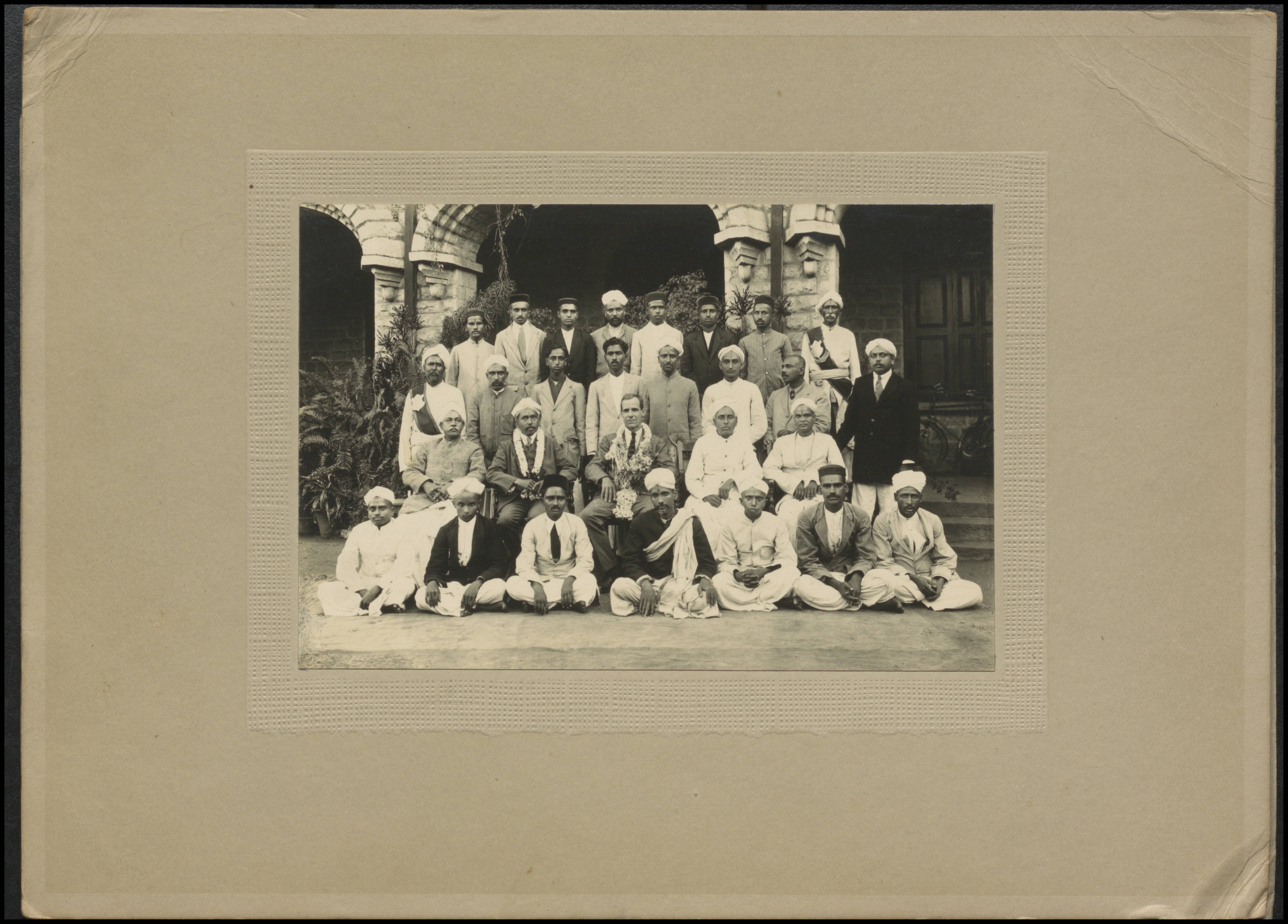 Group photo with 28 people, with Leslie Coleman and another person from India seated and garlanded in centre.
