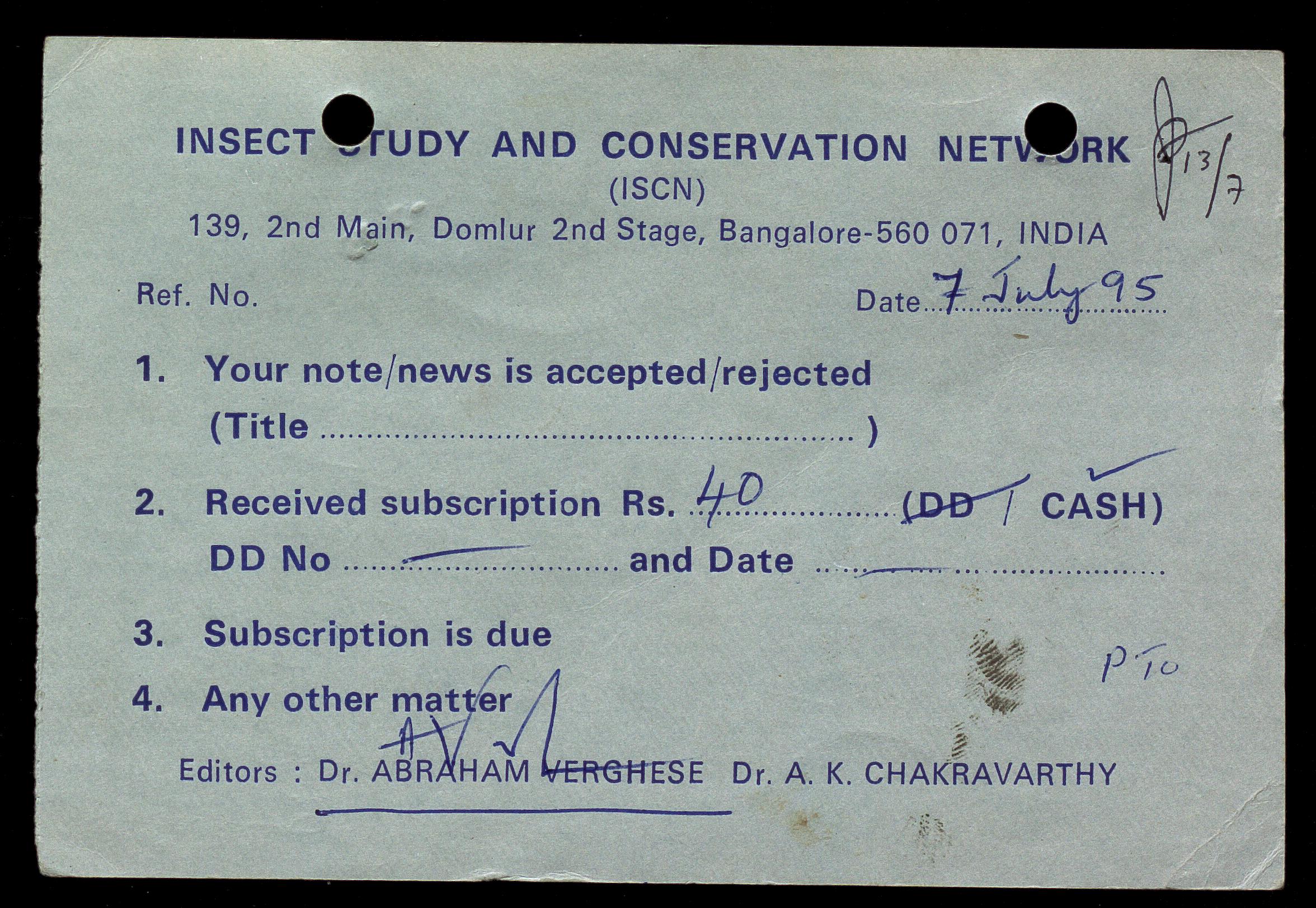 Copyright may not have been assigned to Archives, National Centre for Biological Sciences. The Archives at NCBS makes no representation that it is the copyright owner in all of its collections. The user must obtain all necessary rights and clearances before use of material and material may only be reproduced for academic and non-commercial use. See: https://archives.ncbs.res.in/access. In its capacity as an academic and educational centre, the Archives at NCBS is making digital objects available online for open viewing and research purposes. If you are the rightsholder or a representative of the rightsholder and would like to restrict access to any digital object displayed, please do reach out to us: https://archives.ncbs.res.in/takedown