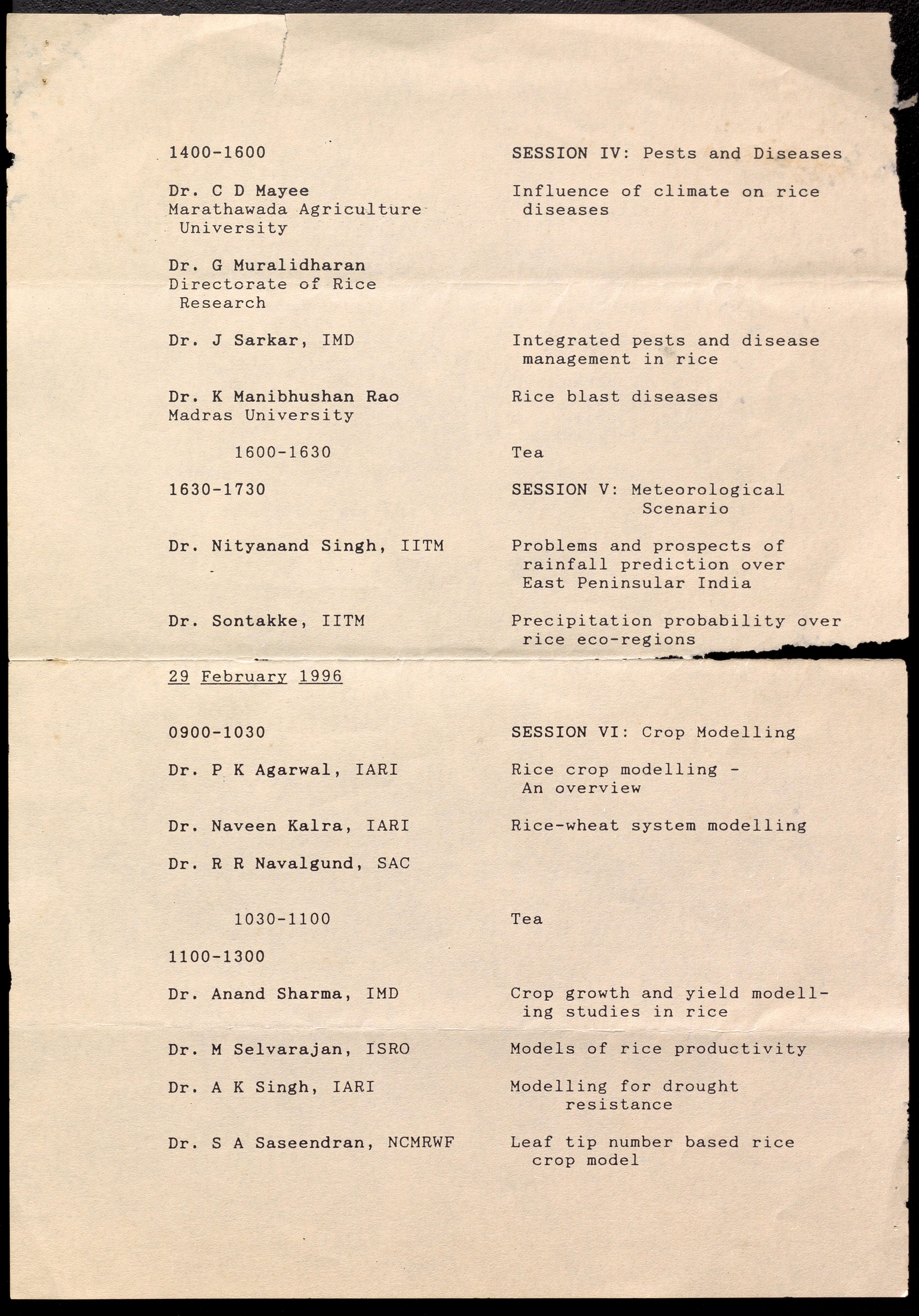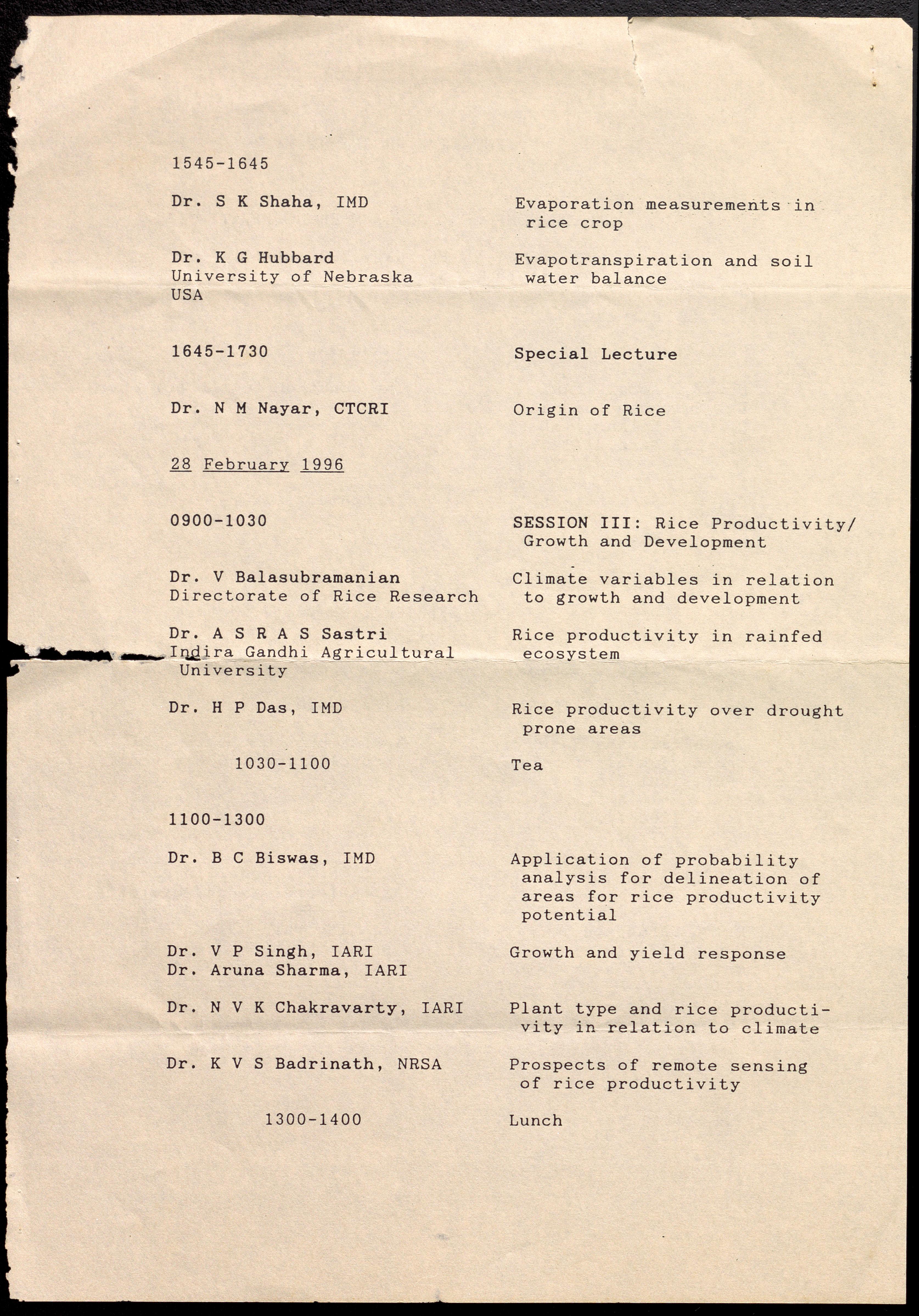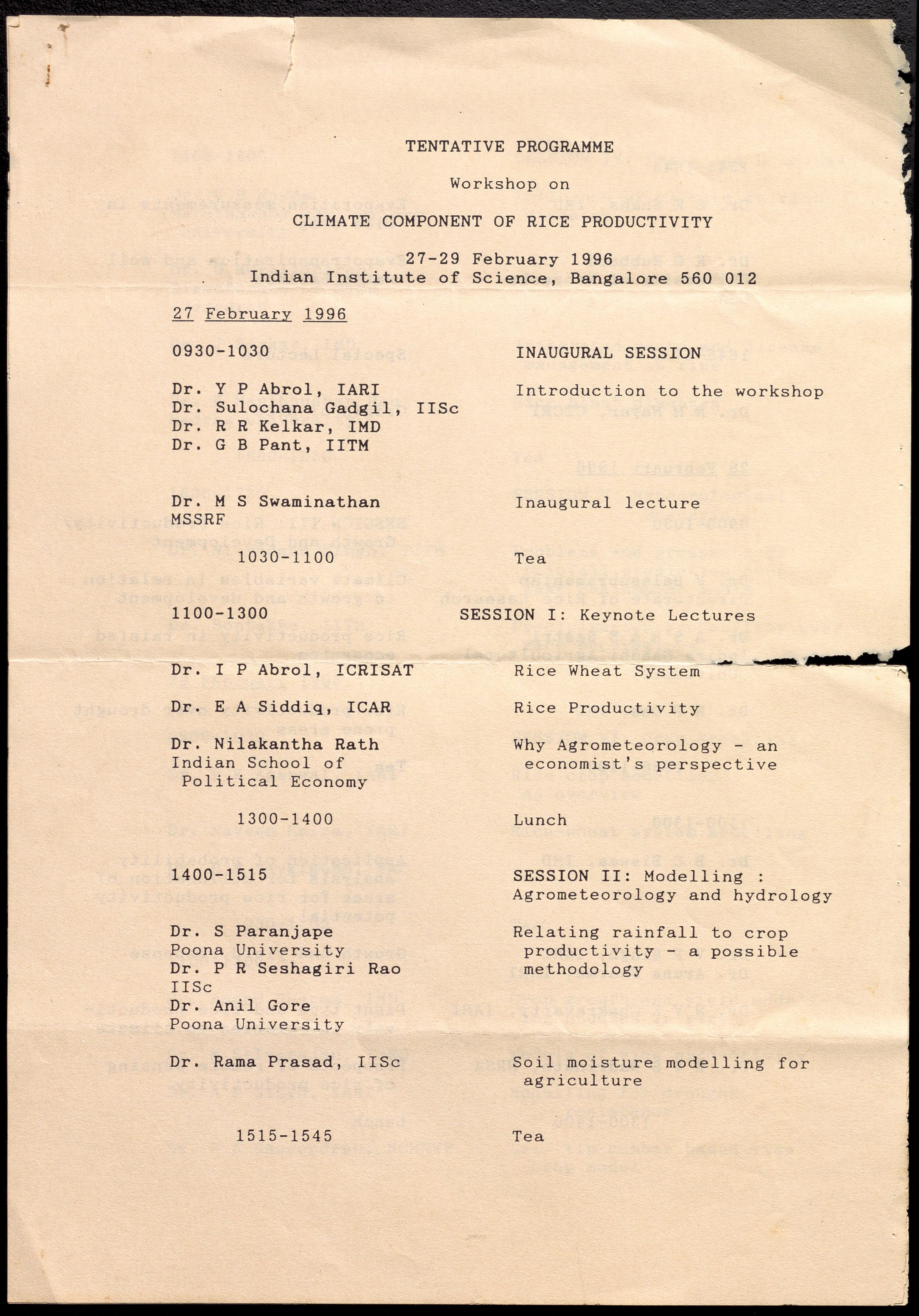 Contains a tentative program of a workshop on "Climate Component of Rice Productivity" held at the Indian Institute of Science, Bangalore